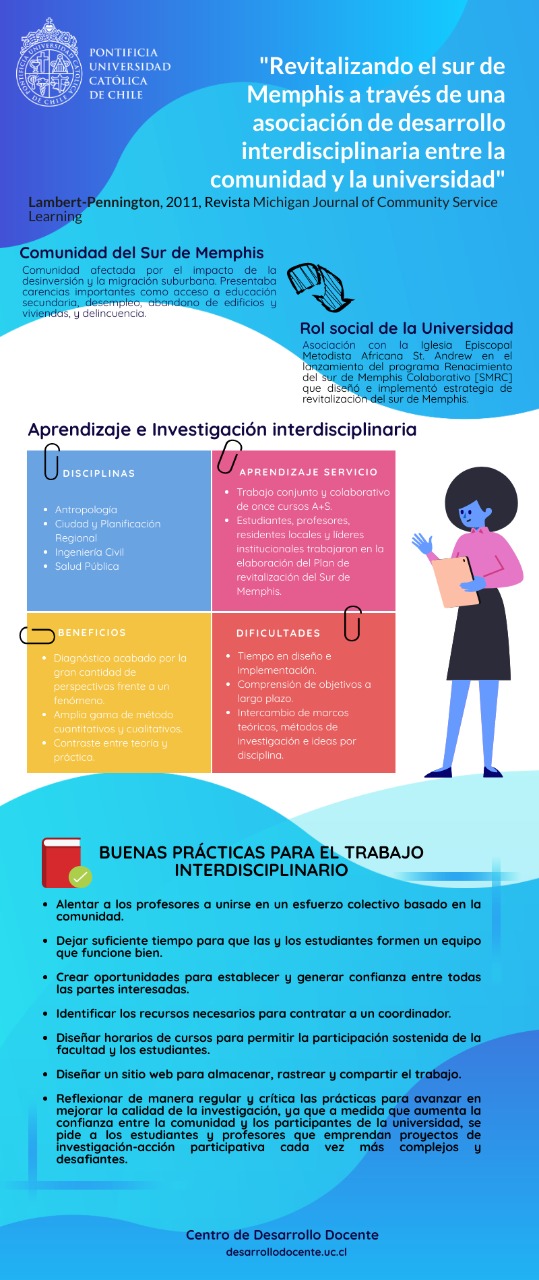 Considerando el escenario de enseñanza interdisciplinar, este artículo hace una revisión de las oportunidades y desafíos vinculados al trabajo en conjunto entre la comunidad y la Universidad de Memphis; acentuando la relevancia de los beneficios del trabajo interdisciplinario en el diseño, implementación y evaluación del mismo. Además, se examinan los obstáculos filosóficos, metodológicos, pedagógicos y organizacionales, para que estos sirvan de insumo para nuevas ideas y propuestas de trabajo interdisciplinar en educación superior.