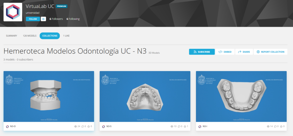 La materialización del proyecto comenzó con la selección de veinte modelos de yeso provenientes de la colección almacenada en la Clínica Odontológica Universitaria (CODUC). Los criterios de selección se orientaron a identificar modelos que ofrecieran la mayor representatividad y diversidad de situaciones clínicas, con el fin de maximizar su valor educativo. Posteriormente, los modelos fueron escaneados y modelados digitalmente hasta obtener imágenes de alta calidad, las cuales fueron etiquetadas e incorporadas en Sketchfab por el equipo de VirtuaLab del Centro de Desarrollo Docente. A través de esta plataforma, quedaron disponibles para su estudio y análisis por parte del estudiantado.