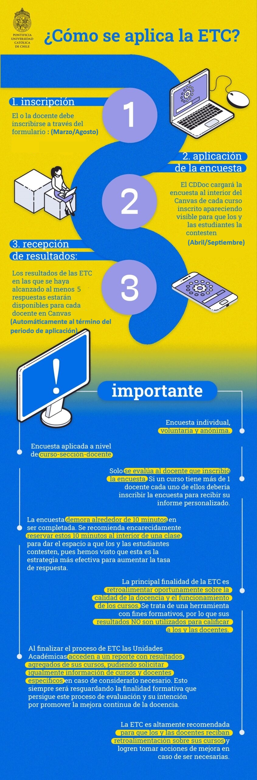 La Evaluación Temprana de Cursos (ETC) es una herramienta que permite evaluar la calidad de la docencia y el funcionamiento de un curso de manera temprana y oportuna durante el desarrollo de un semestre académico y forma parte de los instrumentos de Evaluación de la Docencia. Se trata de una encuesta que evalúa las mismas dimensiones sobre la calidad de la docencia que la Encuesta Docente.